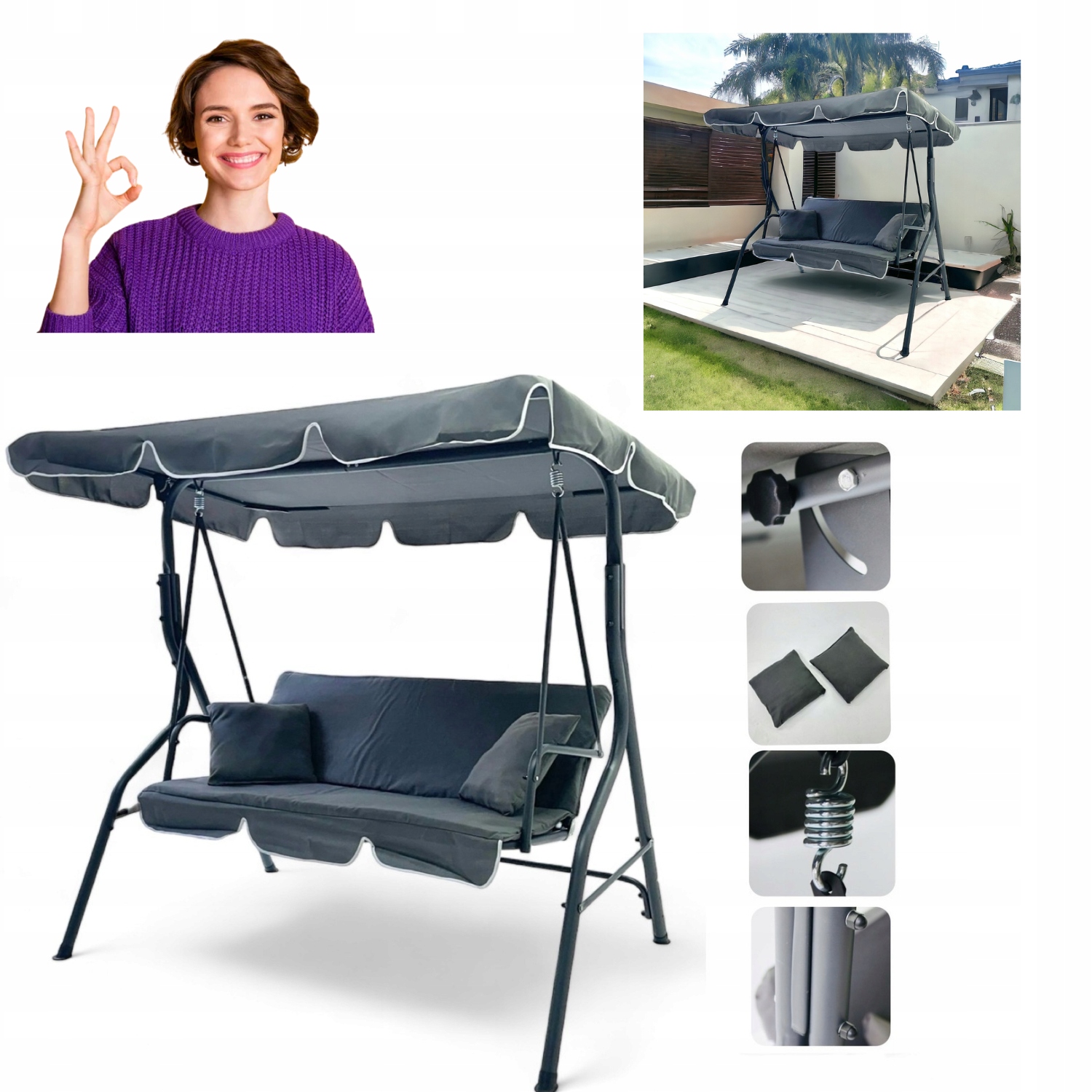 HUŚTAWKA OGRODOWA 3 OSOBOWA SZARA BUJANA REGULOWANY DASZEK MOCNA 240KG Waga produktu z opakowaniem jednostkowym 19 kg